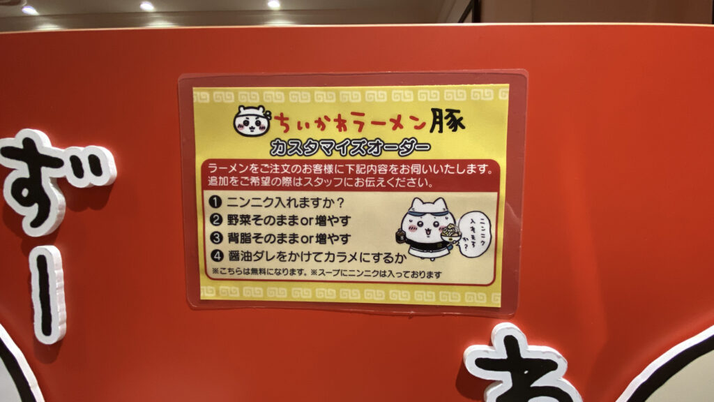 ちなみにラーメン用語ではのカスタマイズオーダーを別名「コール」と呼ばれる独特の注文方法があります。他のお店ではルールが厳しいこともあるようですが、ちいかわラーメン豚の店員さんはとても優しく、丁寧に教えてくれるので安心。